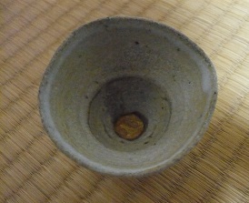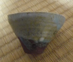 写真下手で実物の凄さを写せなかったが…淡青の漣が静かに打ち寄せる斑唐津の猪口…見込みの底が罅割れて汚物が堆積して使用に堪えなかったから、底を砥の粉漆で埋めて、水ペーパーで均して朱合漆を塗って金粉を敷き詰めてみた…酒を満たせば、水底に満月が揺らめく風情…