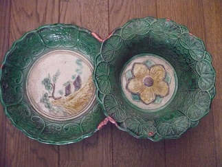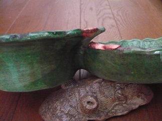 またしても鑑定団二本立てを続けて視聴せざるを得ず…無茶苦茶眠いが無理して見ている…其れにしても何だ此の美しさは、と、血反吐が出るほど其の瞬間に仰天を余儀なくされたのは、物質というものとの生々しい邂逅を見たからであって…かねてより発注していたど銅粉がようやく到着、さっそく銅継ぎを試してみたのであった…対象は、先週紹介した、岩国は錦帯橋での骨董市でお助けした源内焼緑釉二枚一組皿…見ているだけで頭がおかしくなりそうな、珍品というよりも畸形、としか思えない、考え出したらおぞましいばかりの物品である…真贋は不明、だいたい2枚の皿を、成型段階で明らかに意図的に合体させるという目論見の前衛性が江戸時代後期に有り得たのか、しかし源内先生の事だからそれくらいのぶっ飛んだ所業に討って出ても不思議は無し、たとえ偽物だとしても此の畸形此の創意に悔いはないと思わせる奇跡の品であった…