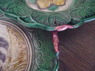 しかし、よく見ると皿の縁が所所大きく欠け、水で洗いながら擦ると其の断面に塗られた安手の塗料が水溶していくという、どうやら緑色の水彩絵具をちょちょっと塗って欠けを誤魔化すという性根が腐りきった繕いを施されていたのであった。絵具がとれた後に見える胎土はどうも白すぎて偽物である事が濃厚なのには目を閉じるとして…前回、金で其の欠けの断面を繕おうとしたら別件の金継ぎで所有していた全ての金につぎ込んでしまい、此方の源内焼にまで回らなかったのが僥倖でもあったと云えよう。此れだけの断面に金粉を敷こうとしたら結構な御値段となる、其処で、金にこだわる必要も無し、すかさず銅を思ったのであった。無論、経時変化によって程よく酸化して、初期のアカガネ色が、器の緑釉に馴染む緑青色になる事を狙ったのは一介の数寄者としては凡庸ですらあった。朱顔料と朱合漆、そしてテレピン油を練って患部に塗り、一時間ほど生乾きにさせて銅粉を蒔いた其の瞬間といったら…錬金術師の悦びもかくやと驚喜させて余りあるほど…純度99.9%の銅そのものが持つ、あの、銅としか言いようのない確かな金属光沢、あの物質感が刃となって鮮烈に顕現、直接小生の心の臓を貫いたのであった…正直言って、金なんかよりもはるかに此の銅の光沢の方が美しい…金は土そのものの光だが、銅は肉そのものの光と云えようか。野上弥生子「秀吉と利休」で、介錯された利休の首の、盛り上がって白い頸椎の芯を取り囲む肉断面を花の艶か何かに喩えていたように記憶するが利休の頸椎の断面を盛り上がって包む首の肉の断面は赤銅色に輝いていたに違いない。取りあえず銅粉を蒔いただけでまだ半乾きの状態で未完成だから目の効く人からすれば杜撰さが目に付くでしょうが、これから、余分にはみ出た処を削り取ったり金属表面に磨きを掛けたり、と、仕上げの作業は残っている、という事を留意して写真を御覧いただければ幸甚です。ちなみに食品への接触があまり好ましくない銅を用いたのは、欠けた部分が器の縁であり、且つ、此の皿が茶会などの折にせいぜい生菓子を置く菓子器を用途としているためで、縁に口を付ける汁物用ではないからである。
