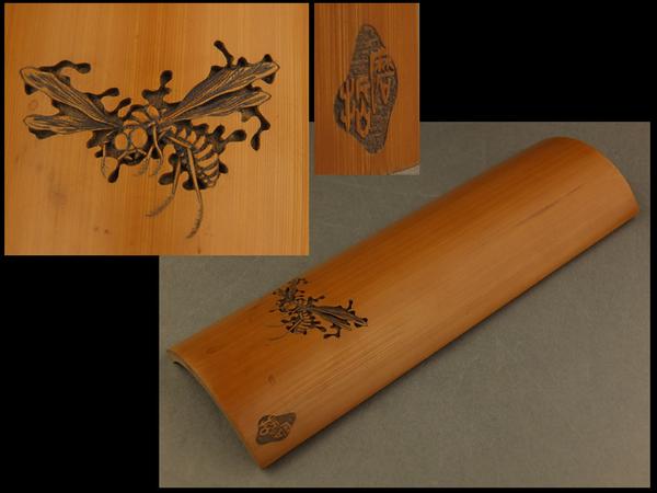 だいたい、いつの頃から、歌舞伎の女形「おやま」を「おんながた」と読んで恥じぬようになったのか。一体いつから、おじいさんおばあさんの事を「じいじ」「ばあば」などと呼称するようになったのか。赤ちゃん言葉で己を措定して恥じぬのは誰か。赤ちゃん言葉で呼ばれるのに反発せぬ鷹揚な態度が大人の余裕、という事なのか。「団塊スタイル」とか「人生の楽園」のせいなのか…不気味に憤激が甦る昼日中の曇天の明るみで…言い掛かりとやっかみを止めたい。どういう事情なのか最近、ネットオークション界で、竹彫茶合界がアツい…素人風流人の手すさびの粗悪な彫りの茶合ばかりが出回っていたこの世界だが、しぶとくチェックしていると、最近はなかなかの佳品に廻りあう事も多い…何があったか。この、アナ蜂を彫った茶合は、磨哲、という謎の彫り師の作だが、本気で獲りにいこうかと身を乗り出したが入札者90人以上、落札額が17万円まで釣りあがって断念せざるを得なかった…自分で彫れるようにならなければ。猛省を促す。