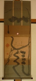 荒み茶会 初座 席上揮毫 菜っ葉の掛軸に大字書「荒」 仄仄 書