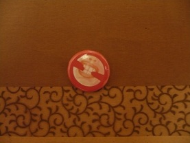 拡大 画竜点睛としての缶バッチ「噛みマーク」(禁止記号の内側から噛み付く、小生の諸活動のシンボルにして家紋) 細君 製作