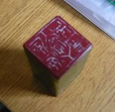 ここが踏ん張り処ぞ、と、くじけず、印材の反対の面に再チャレンジ。慣れぬ彫刻作業で指の感覚が麻痺しつつ飲酒と眠気で目が霞む中、刻みが弱くなるのを挽回できない苦しさも堪えつつ、午前3時半頃、何とか仕上げたのがこれ。いまいちな出来ではあるが、千里の道も一歩から。篆刻という、書道の中でもとりわけディープな世界に真っ先に突入した夜明けである。まだ指が麻痺している…。