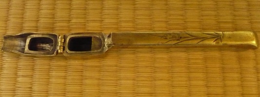 長引く歯の治療…長年の歯磨きの怠りが祟っての此のザマだから致し方ないので、じっくり腰を据えて取り掛かっているとは云え…今回はさすがににっちもさっちもいかぬ重症と云うよりか、王手飛車取りみたいな、治療しても地獄、しなくても地獄と云う袋小路で…気落ちする憔悴は将来不安を確実にして落剝の色は濃く…病状と治療と其の経緯は紆余曲折を極めて説明する気力もなく気が滅入るばかり…ただ…物を嚙むと痛む、しかも神経を抜いたのに、と云う…食べる喜びが地味にしかし着実に阻害され心身の衰弱ひいては人生の楽しみさえも見通せない絶望感…酒飲むしかないのか。異常に品ぞろえが良い古本市に行く…そうした場所ではなるべく余計な好奇心の感度を高めない事が必要…読まなければならない本を大量に抱えて一向に進んでいないのだから…それで、気軽に知識を得られるブルーバックス百円を三冊を手早く購入後…本以外に戦前の葉書などがあるのは分かるが…なぜか茶道具や刀身具、刀の鍔などが文庫本と連続的に陳列してあるところで、矢立が気になる…江戸時代の携帯用筆記用具…筆入れと墨ツボが一体化した物で、煙管入れと根付のセットと並んで、江戸の庶民の工芸が花開く日用品…10本くらい箱に投げてあるものの中からよさげなのを探す…ほとんど真っ黒の真鍮製の矢立…しかし、かすかに見える彫金の冴えを見逃さず…家に帰ってあの手この手で清掃に取り掛かる…ネットで、酢に漬けるとよいとあったから試したが得体のしれぬ黒い汚れは落ちず…逆に漬け過ぎて真鍮の一部がまだらの赤銅色になってより一層小汚くはなったが…結局、真鍮ブラシで地道に磨くと真鍮らしい金属光沢が蘇った…水辺の蒲、その上から水辺の餌めがけて垂直に突っ込む水鳥を描く、切れ味が迷いなく素晴らしい彫金も蘇る…あとは、中が墨と錆で真っ黒だから、其の固着をどうやって落とすか、辛抱強く取り掛かるつもりだ。因みに、墨ツボの中を綿棒でほじくると、糞汚い真っ黒な綿が出てきた。綿に墨液を含ませて液漏れを防いでいたと見える…江戸時代の人の工夫がうかがえる。